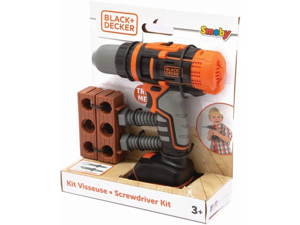 Realistická licencovaná vŕtačka Black & Decker pre bezpečnú hru na dielňu. Funguje mechanicky – bez batérií, má pravo-ľavý chod a vymeniteľné nástavce, takže deti zvládnu „vŕtať“, skrutkovať aj povoľovať na priložených maketách. Kompaktné rozmery cca 17 × 22 × 5 cm sedia do detskej ruky a hra je pripravená hneď po vybalení.