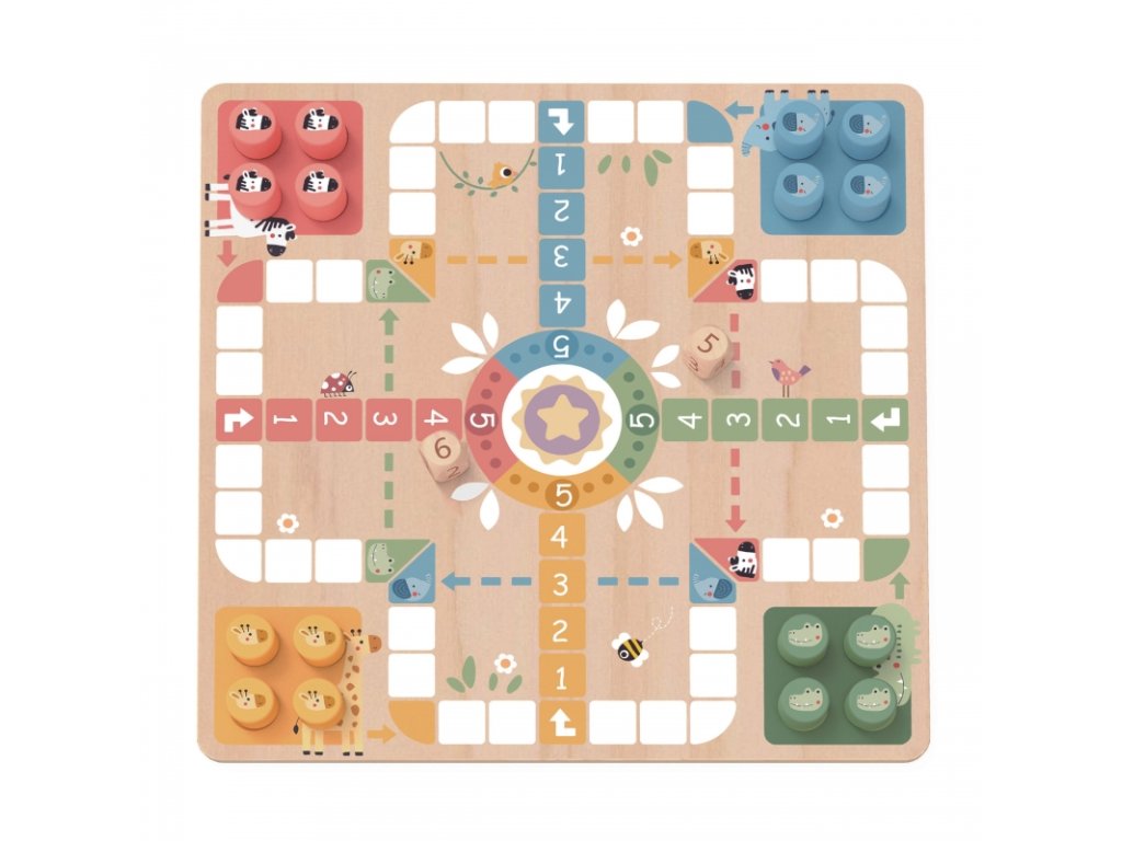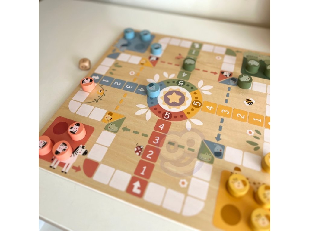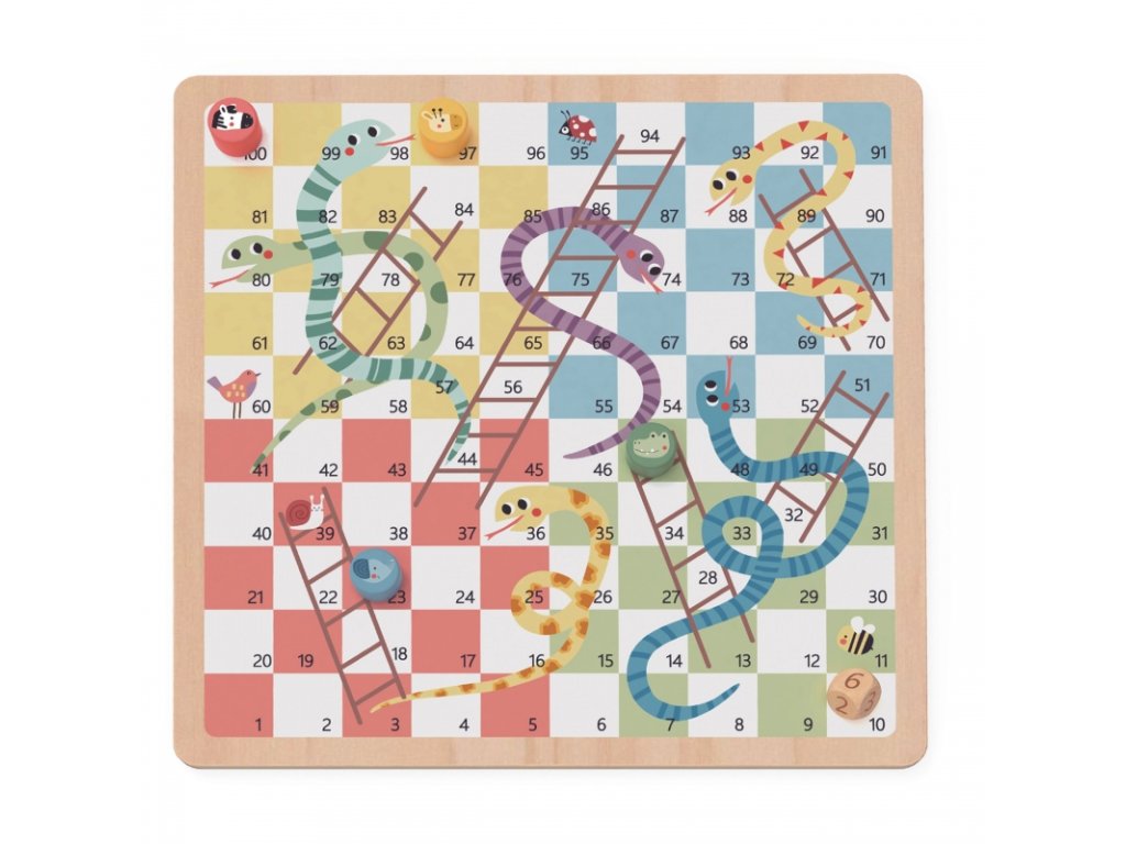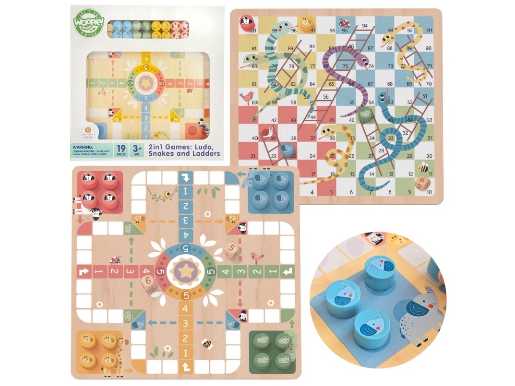 Spoločenská hra pre deti od 3 rokov v príjemnom drevenom pastelovom prevedení. Obojstranná doska od Woopie ponúka na jednej strane Človeče, nehnevaj sa (s roztomilými figúrkami – slon, zebra, žirafa či krokodíl) a na druhej strane obľúbené Hady a rebríky. Ideálne, keď si chcete doma striedať hry a mať širšiu ponuku.