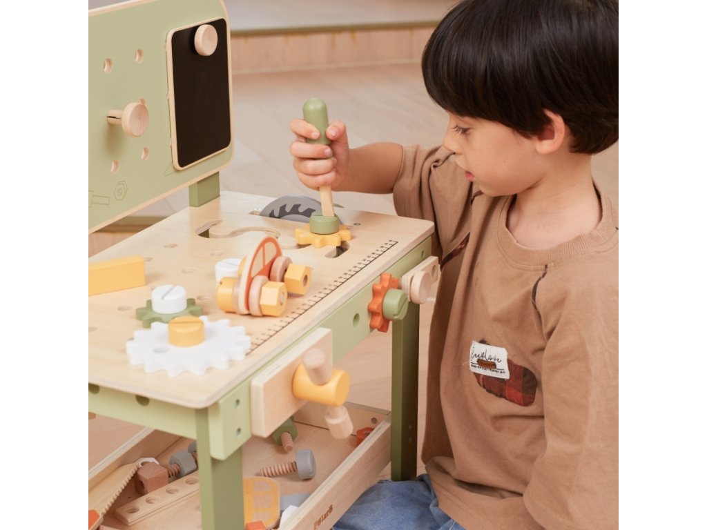 Śtýlová dielňa premení vaše dieťa na skutočného mechanika. Na veľkom drevenom pracovnom stole môže skrutkovať dosky, meniť kolesá na autíčkach a tiež skúšať, ako spolu fungujú ozubené kolieska. Zadná stena ponku ponúka hodiny s ručičkami, tabuľku a dierkovanú stenu, na ktorú si deti priskrutkujú nástroje a rôzne dieliky.