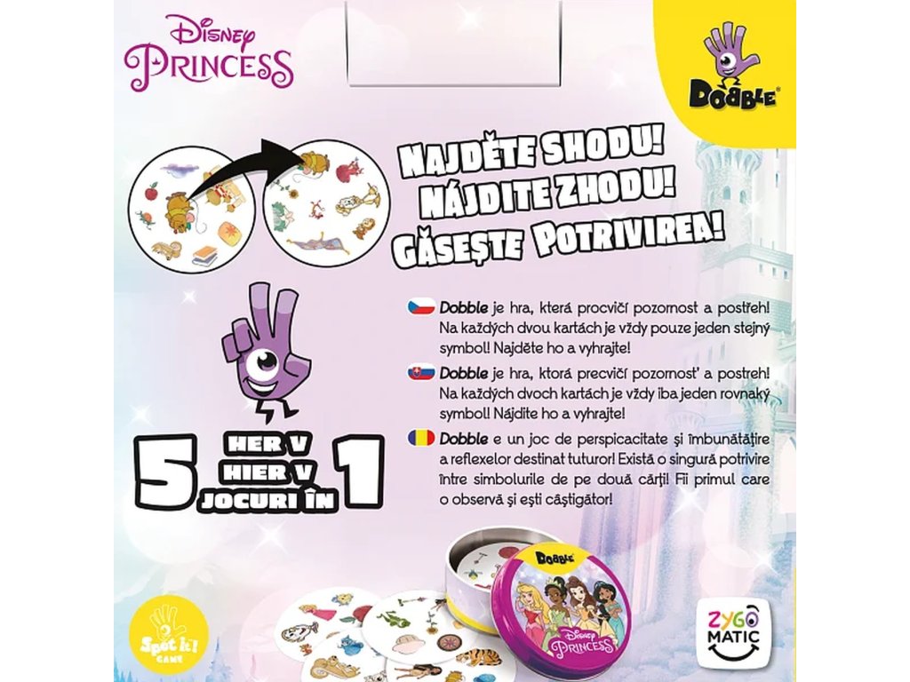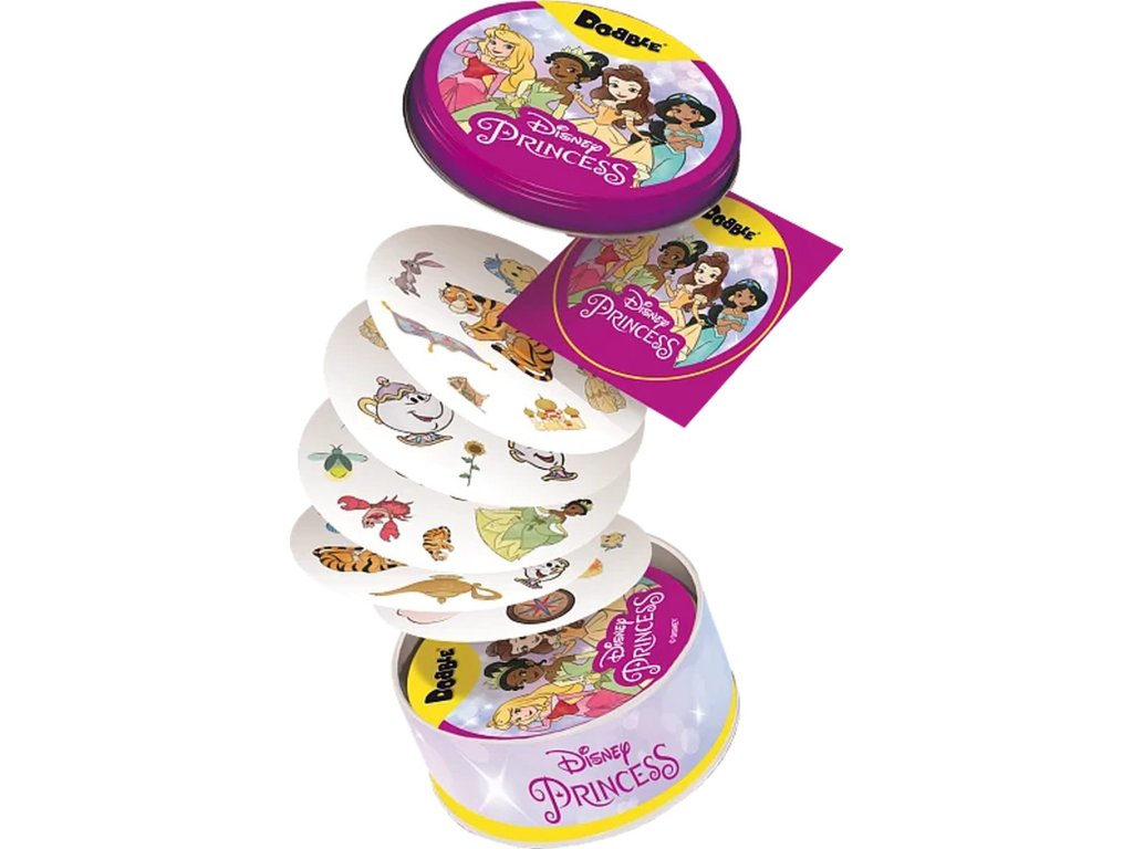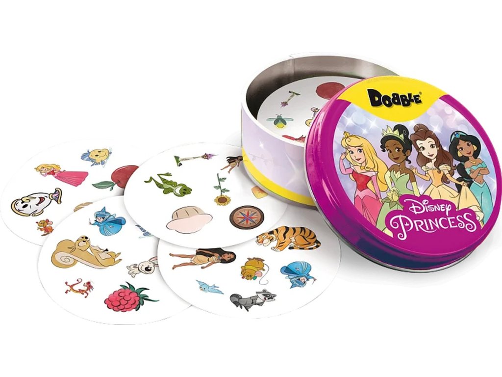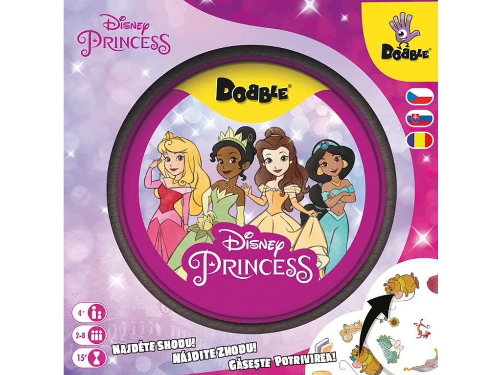 Dobble Disney Princess je svižná postrehová hra s obľúbenými princeznami Disney. Medzi ľubovoľnými dvoma kartami vždy existuje jediný spoločný symbol – kto ho nájde skôr, vyhráva. Vysvetlené za minútu, hrané za chvíľu, zábava na rodinné popoludnia aj cesty.