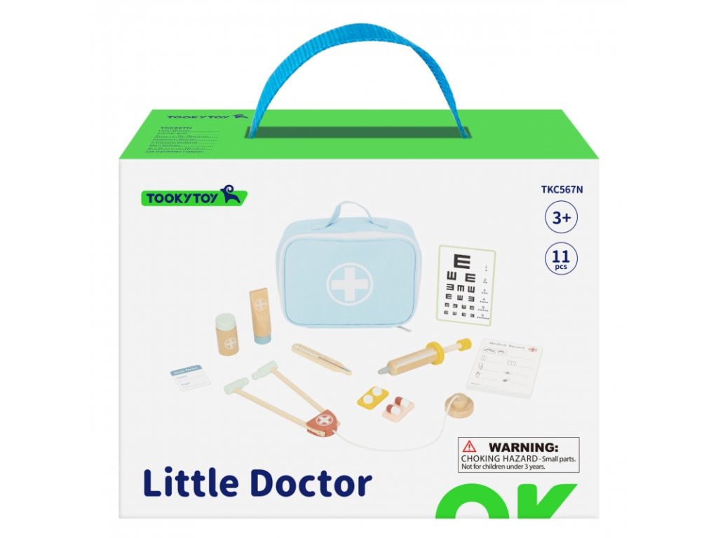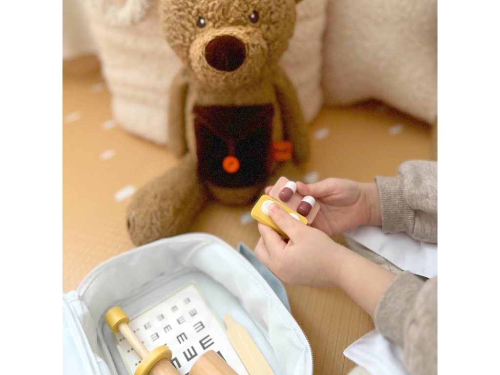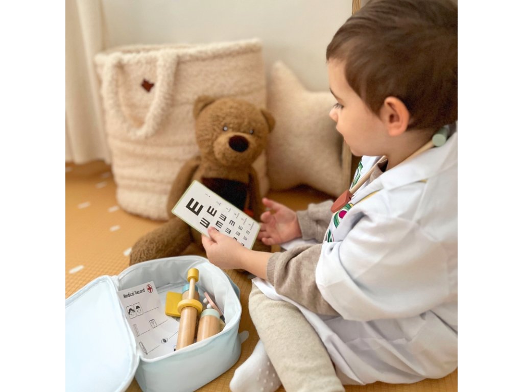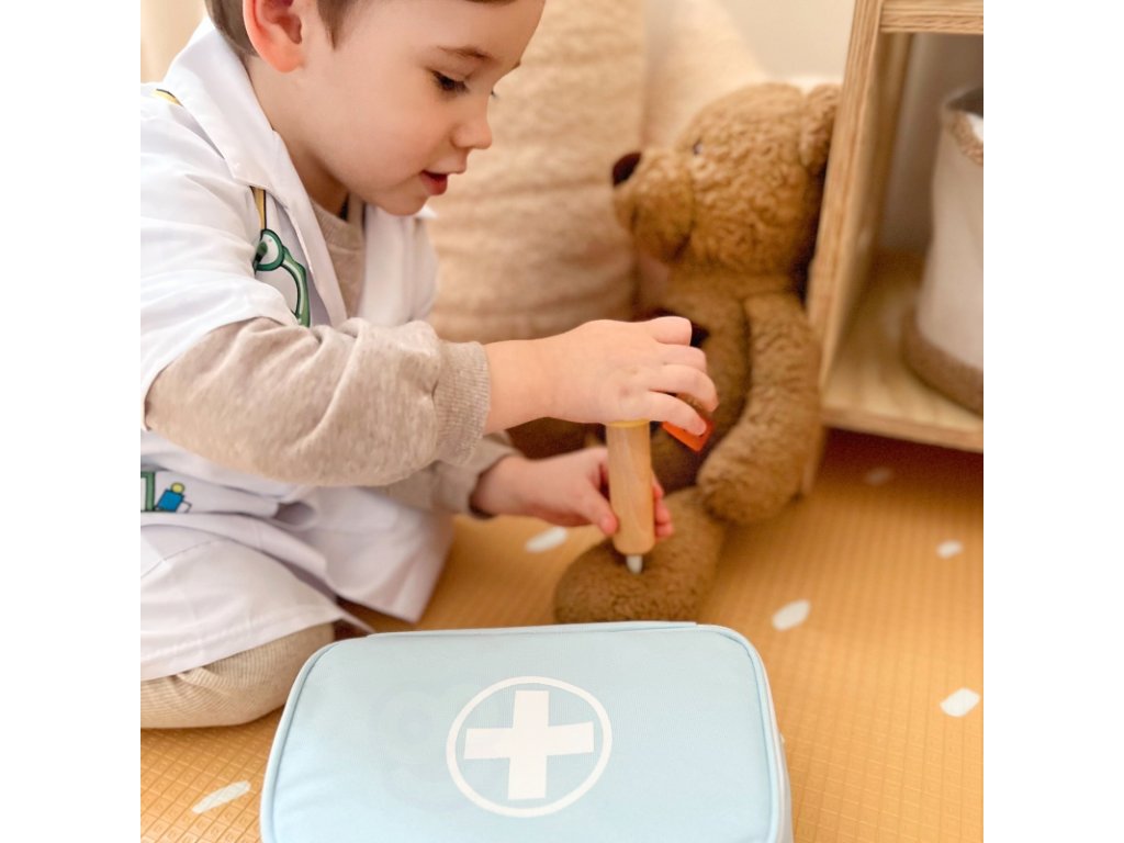 Drevená doktorská sada pre deti v textilnom kufríku umožní deťom zahrať sa na doktora doma aj vonku. Vďaka bohatej výbave – ako je fonendoskop, injekcia, teplomer, rôzne mastičky, lieky a ďalšie doplnky – sa budú deti cítiť ako skutoční lekári. Po „ordinovaní“ sa všetko vybavenie jednoducho uprace späť do látkového kufríka. Sada je praktická, skladná a vďaka menšej veľkosti ju ľahko vezmete so sebou aj na cesty.