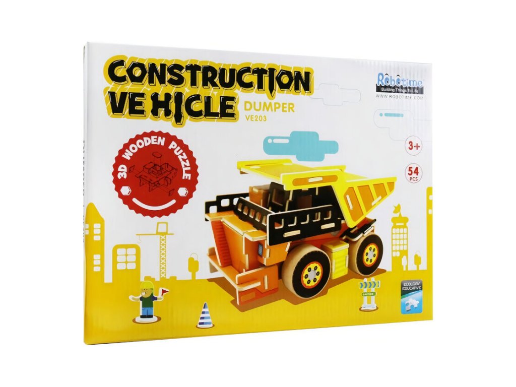 Kvalitné 3D puzzle s nízkou náročnosťou zostavenia vhodné pre deti od 4 rokov. 54 precízne vyrezaných farebných dielikov slúži na zostrojenie stavebného stroja. Z drevenej preglejky hrubej až 6 mm sa najprv vytlačia farebné dieliky. Poskladá sa stavebný stroj, pridajú sa veľké a hrubé kolesá. V sade je aj dielik robotníka a 2 značky. V balení je detailný návod na zostavenie.