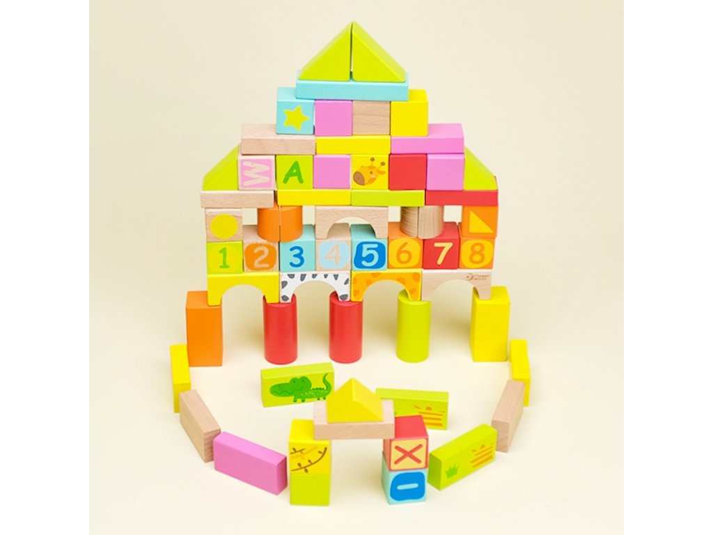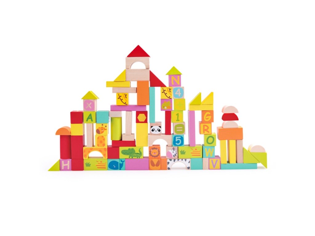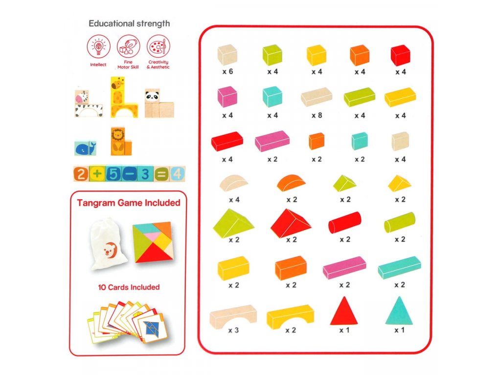 Sada veľmi pekných a veľkých drevených kociek s rôznymi prvkami ako zvieratá, písmena a číslice umožní deťom už od 12 mesiacov nekonečné množstvo stavania, učenia, zábavy a hrania. Súčasťou kociek je aj tangram.
