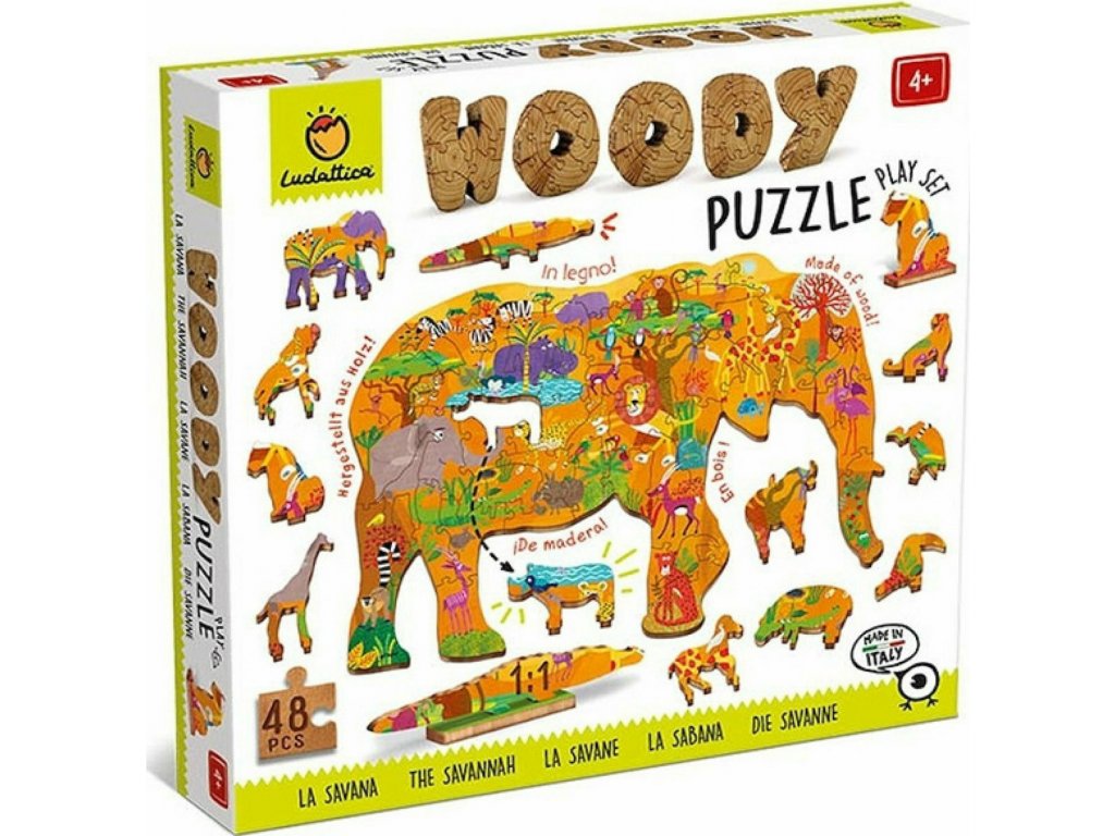 Nádherné drevené puzzle, ktoré nemá zarovnané dieliky na aké sme všetci zvyknutí, ale každý dielik je iný. Preto je toto puzzle aj náročnejšie a je výzvou nielen pre deti, ale aj pre dospelých. Puzzle je kvalitne vyrezané, aby dieliky do seba ľahko zapadali. Deti skladajú puzzle do veľkého obrázka slona a pritom do neho vkladajú aj vyrezané zvieratá savany. Tieto malé zvieratá možno postaviť aj samostatne na drevené podstavce. Puzzle je veľmi pekne spracované, podporuje u detí vizuálne vnímanie, sústredenie, priestorovú orientáciu a pamäť. Puzzle je vhodné pre deti od 4 rokov.