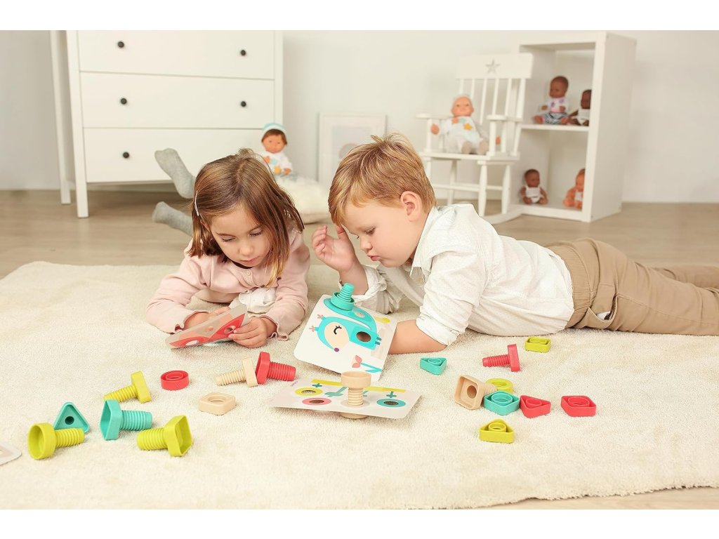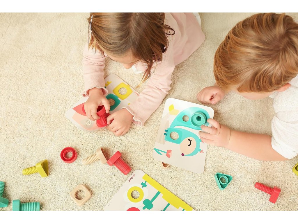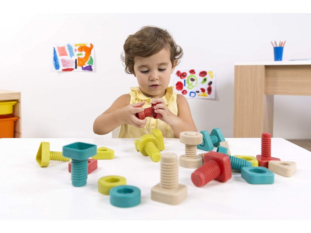 Hra so skrutkami a maticami na precvičenie jemnej motoriky, poznávanie základných geometrických tvarov a farieb pre najmenšie deti. Dieťatko sa dajú spojiť vždy iba rovnaké tvary, keďže štvorcová matica pasuje iba so štvorcovou skrutkou, trojuholníková matica iba s trojuholníkovou skrutkou a kruhová iba s kruhovou skrutkou. Je to vďaka hrúbke skrutky, resp. šírke otvoru matíc, ktorú má každá matica inú. Dieťa pri hre spája skrutky a matice, alebo ich pripevňuje na hracie karty.