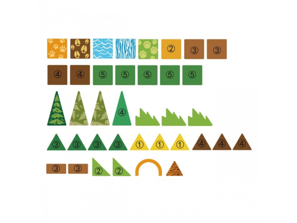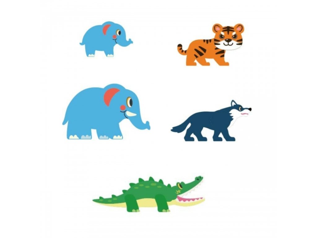 - 5 zvieracích figúrok ( malý slon, veľký slon, tiger, krokodíl, vlk)