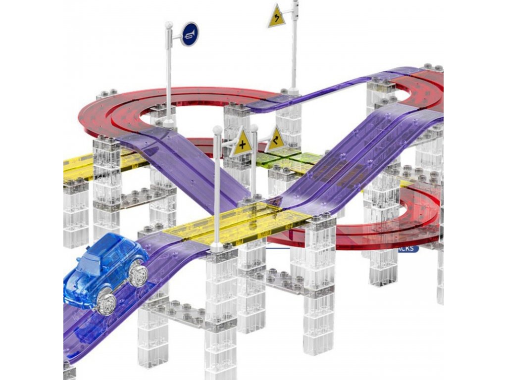 Deti si postavia jednoduchý okruh alebo viacúrovňovú trať s mostami, rampami a zákrutami. Montáž je rýchla a bez náradia, diely pevne držia a ľahko sa kombinujú.
