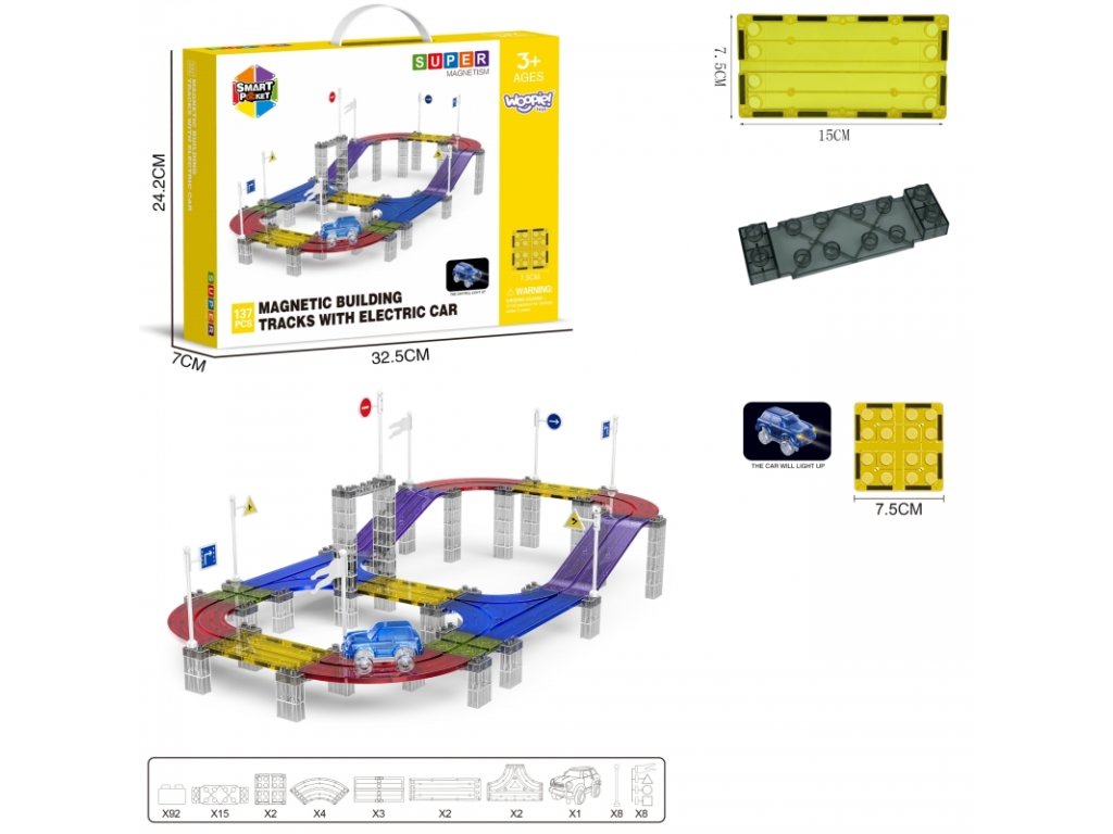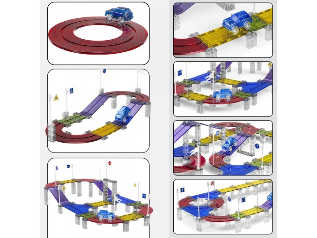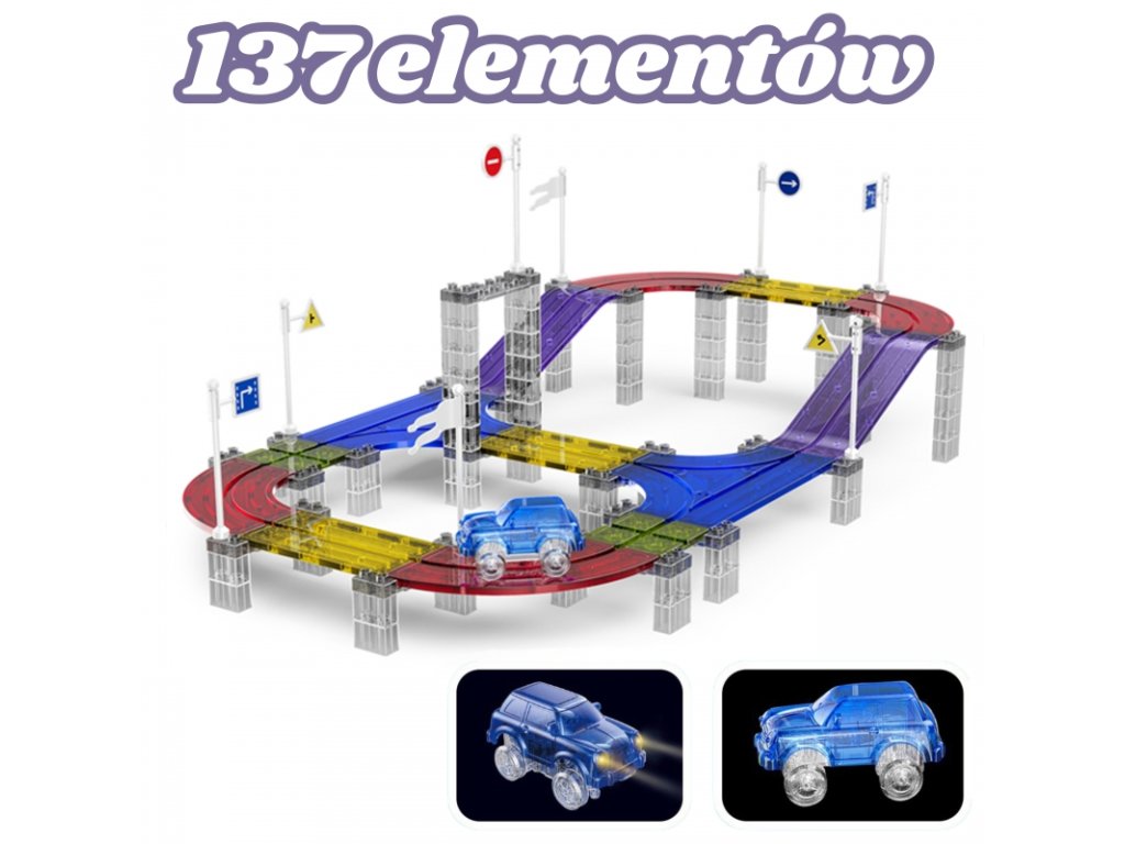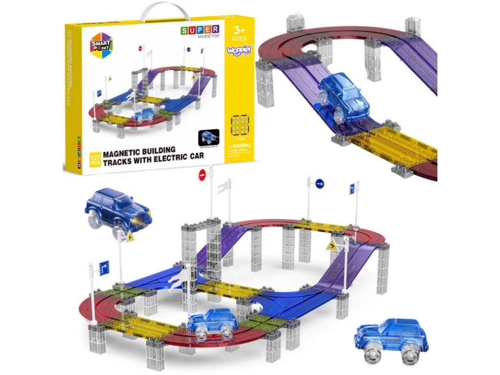 Magnetická závodná dráha premení izbu na pestrofarebný okruh. Priehľadné diely, silné magnetické spoje a stabilné výstupky udržia autíčko v stope aj pri rýchlej jazde. LED autíčko svieti počas jazdy, takže hra má čaro cez deň aj večer.