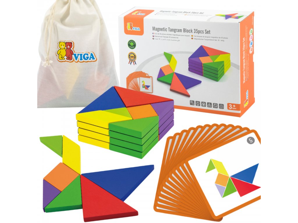 Tangram je starobylý hlavolam pochádzajúci z Číny a vraj sa s tangramom bavil už aj Napoleon Bonaparte. Čaro tangramu spočíva v jednoduchosti - z jediného štvorca môžeme zostaviť množstvo rôznych postáv, zvierat a vecí. Magnetický tangram obsahuje 35 veľkých magnetických dielikov a 20 obojstranných predlôh, podľa ktorých sa dajú postaviť rôzne vzory. Sada neobsahuje magnetickú tabuľku, magnetické dieliky sa môžu ukladať napríklad na chladničku. Súčasťou je aj látkové vrecúško, ktoré slúži pre ľahšie skladovanie dielikov. Hlavolam rozvíja logické a priestorové myslenie.