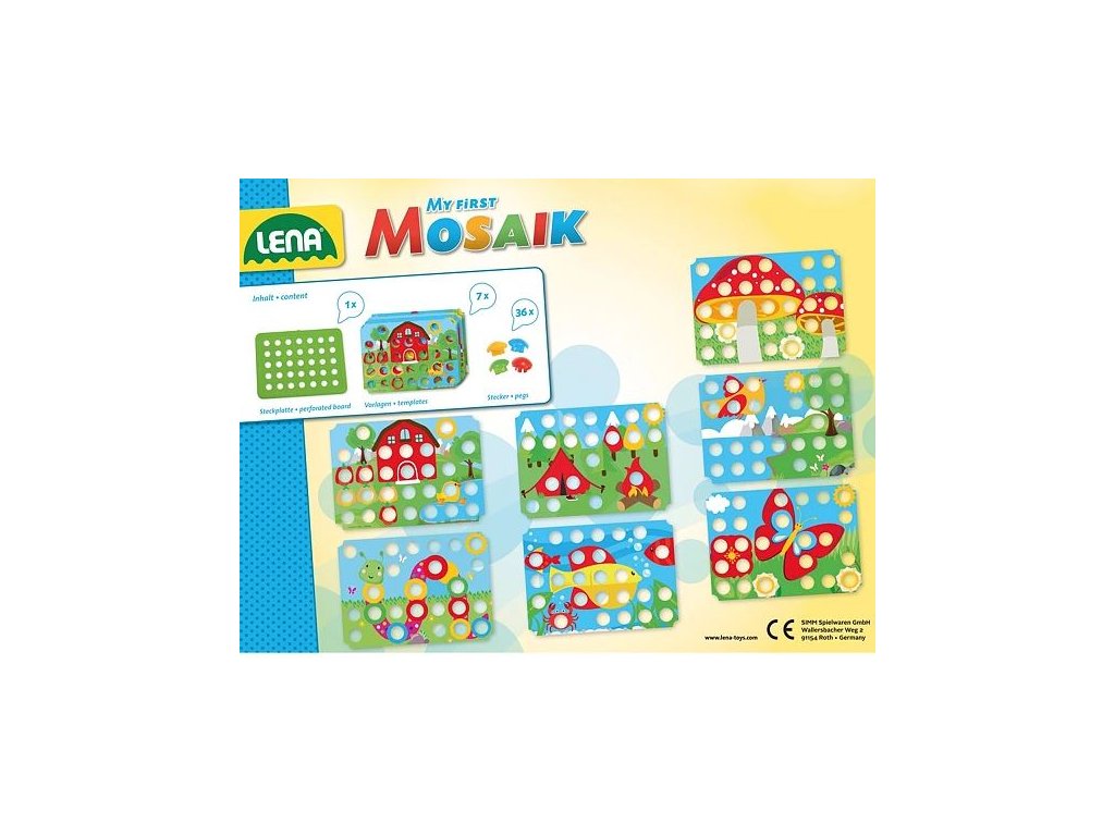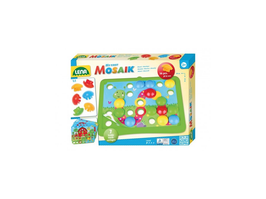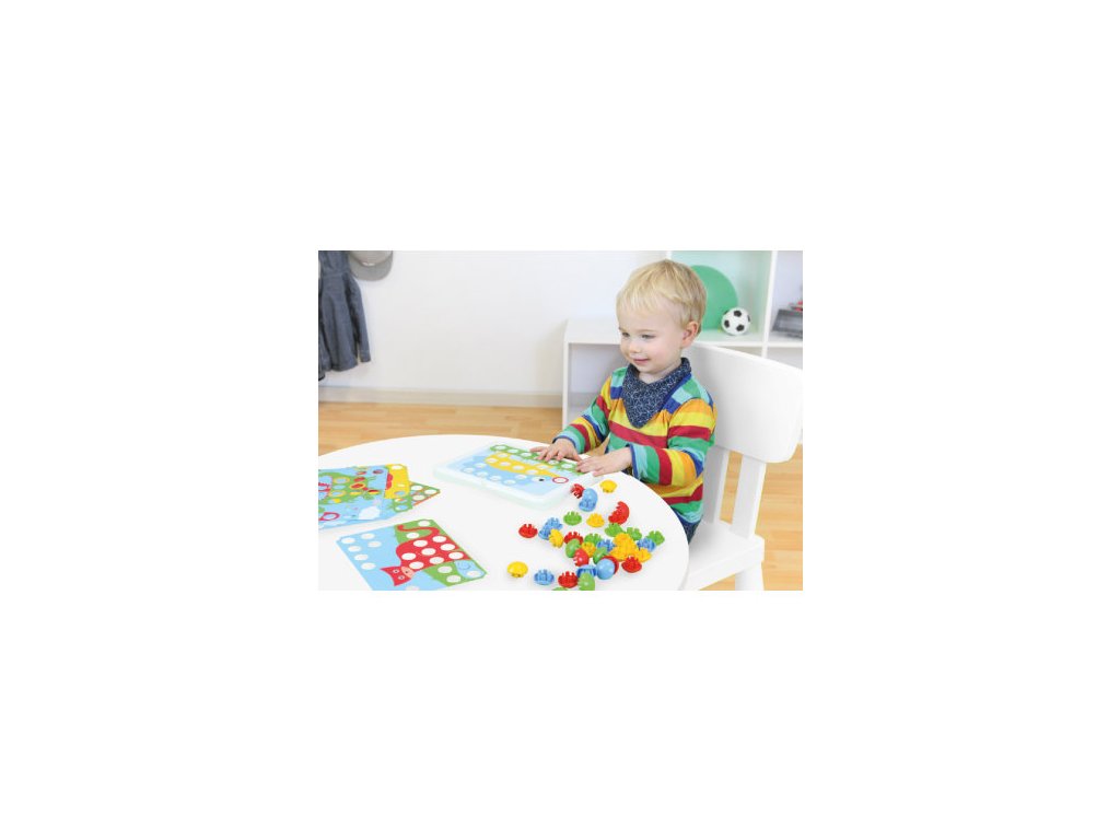 Mozaika je vďaka veľkým gombíkom určená pre deti už od 2 rokov. Súprava rozvíjajúca detskú motoriku, tvorivosť a fantáziu sa skladá z hracej dosky s otvormi, 36 veľkých farebných gombíkov (priemer 32mm) a 7 kariet s predlohami.