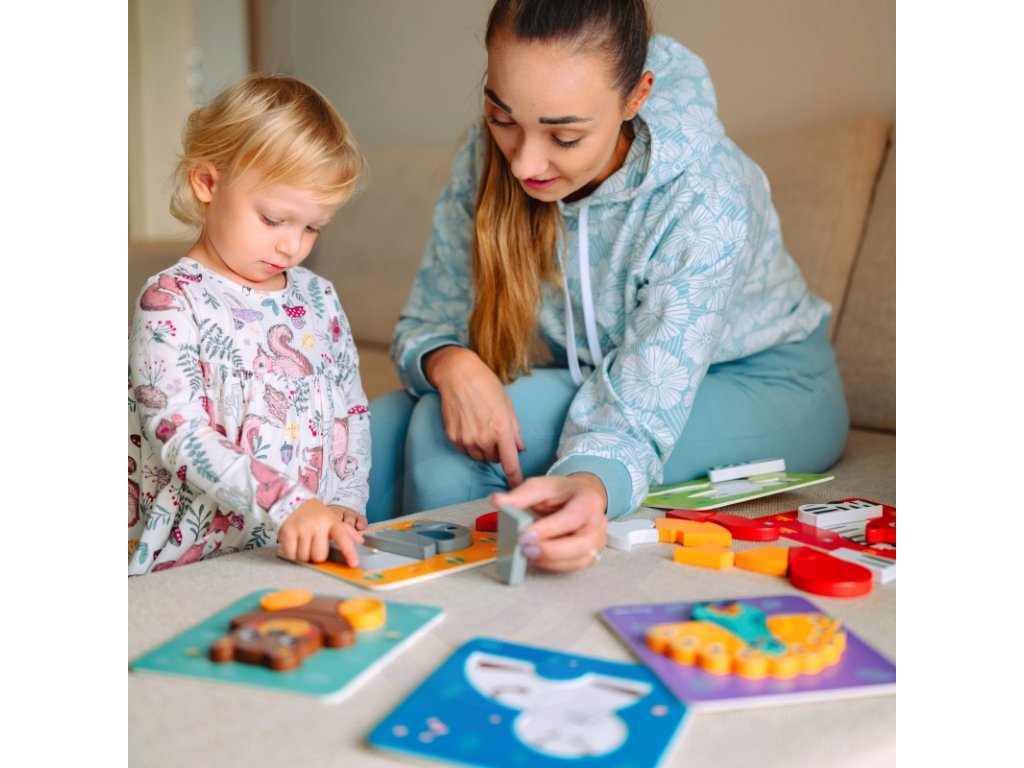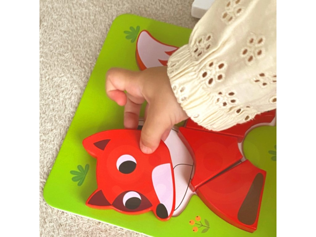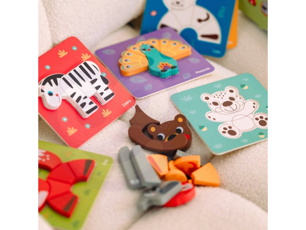 Masívne drevené puzzle je čarovná sada zvieratiek určená pre najmenšie deti už od 12 mesiacov. Každý obrázok puzzle pozostáva z 5-7 veľkých drevených dielikov dobre uchopiteľných pre malé detské rúčky. Dieliky sa vkladajú do jemne vyhĺbenej podložky, špeciálne navrhnuté priehlbiny zabraňujú pohybu drevených prvkov. Obrázok zvieratka na podložke je jednofarebný pre väčšiu obtiažnosť.