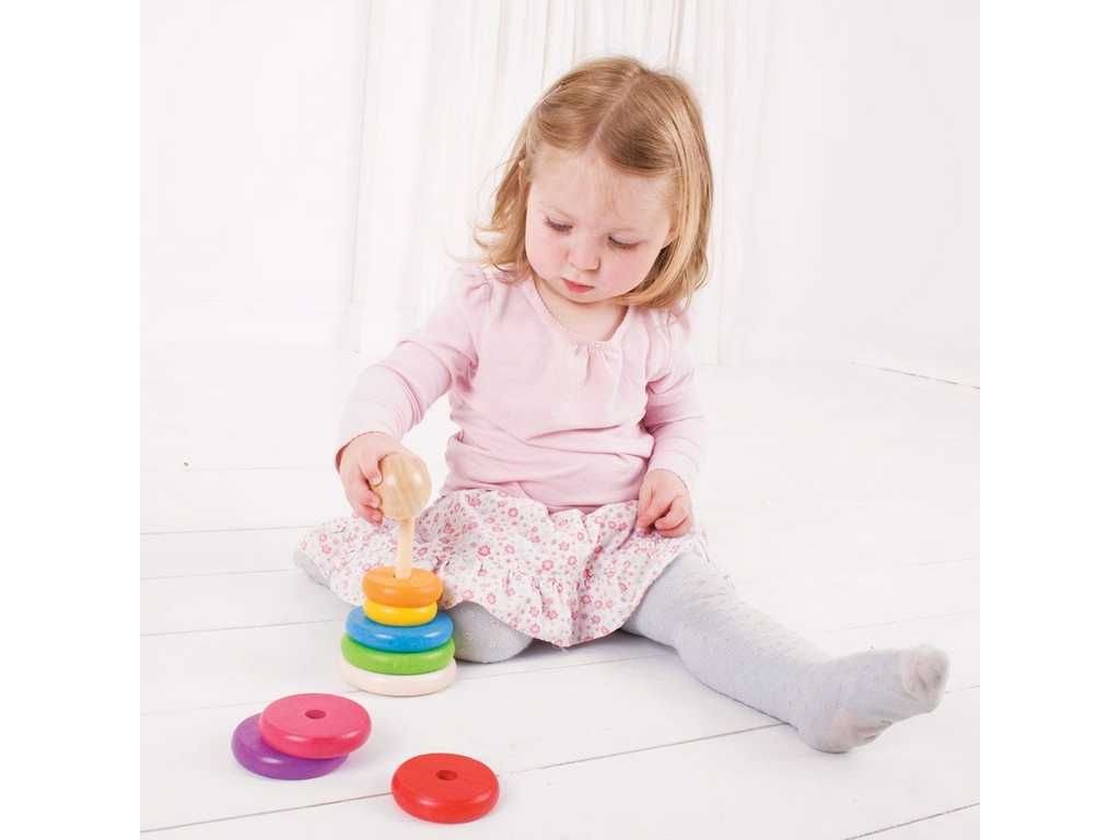 Nestarnúca drevená obľúbená hračka pre deti od 12 mesiacov. Nasúvacia tyč je s podložkou spojená len šnúrkou pre väčšiu bezpečnosť detí v prípadoch, keby na hračku spadli. Hračka pomáha rozvíjať motoriku, poznávanie farieb a veľkosti tvarov nasadzovaním drevených krúžkov na tyč.