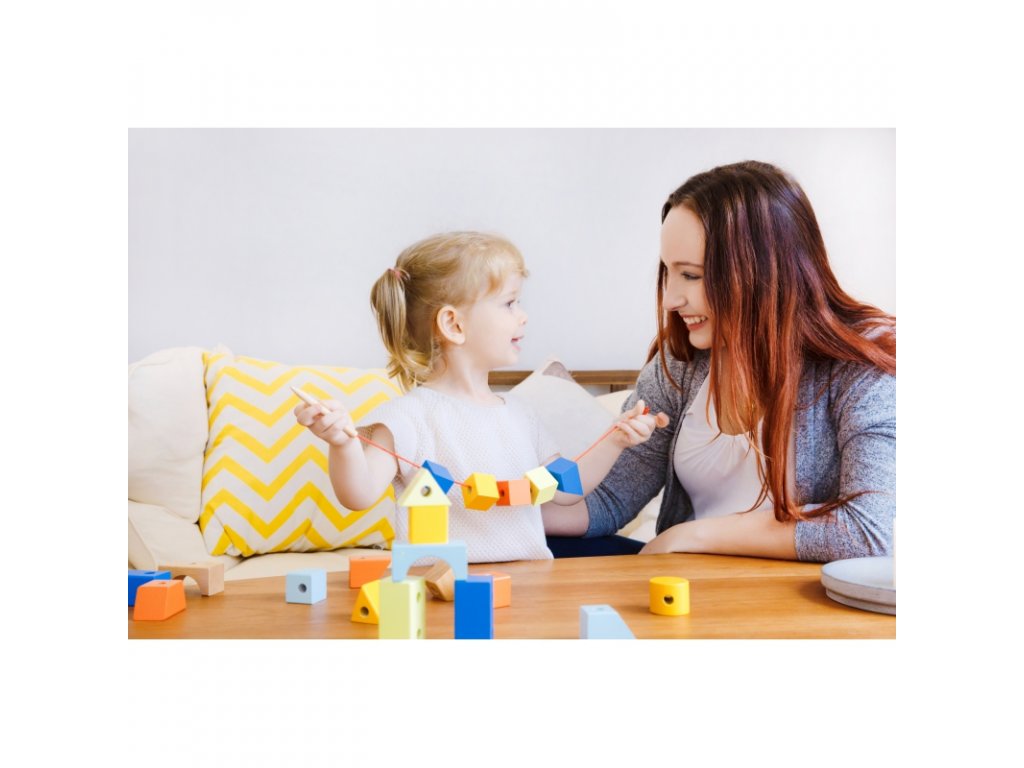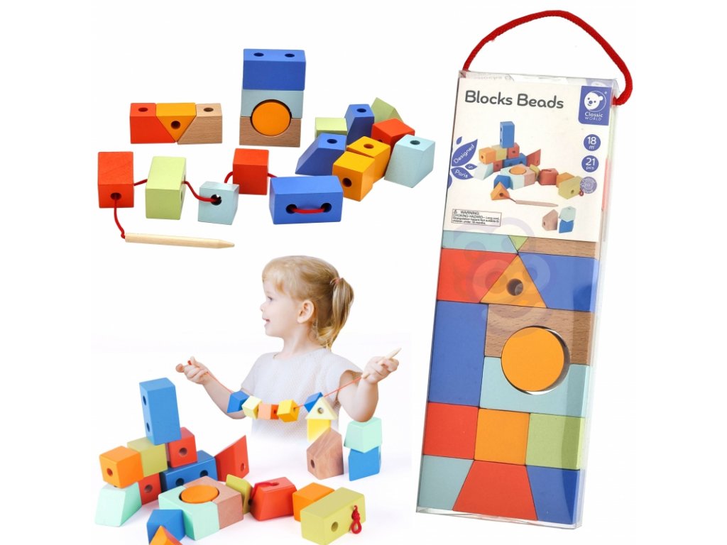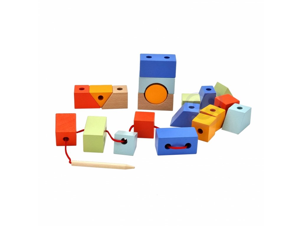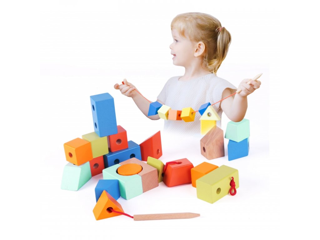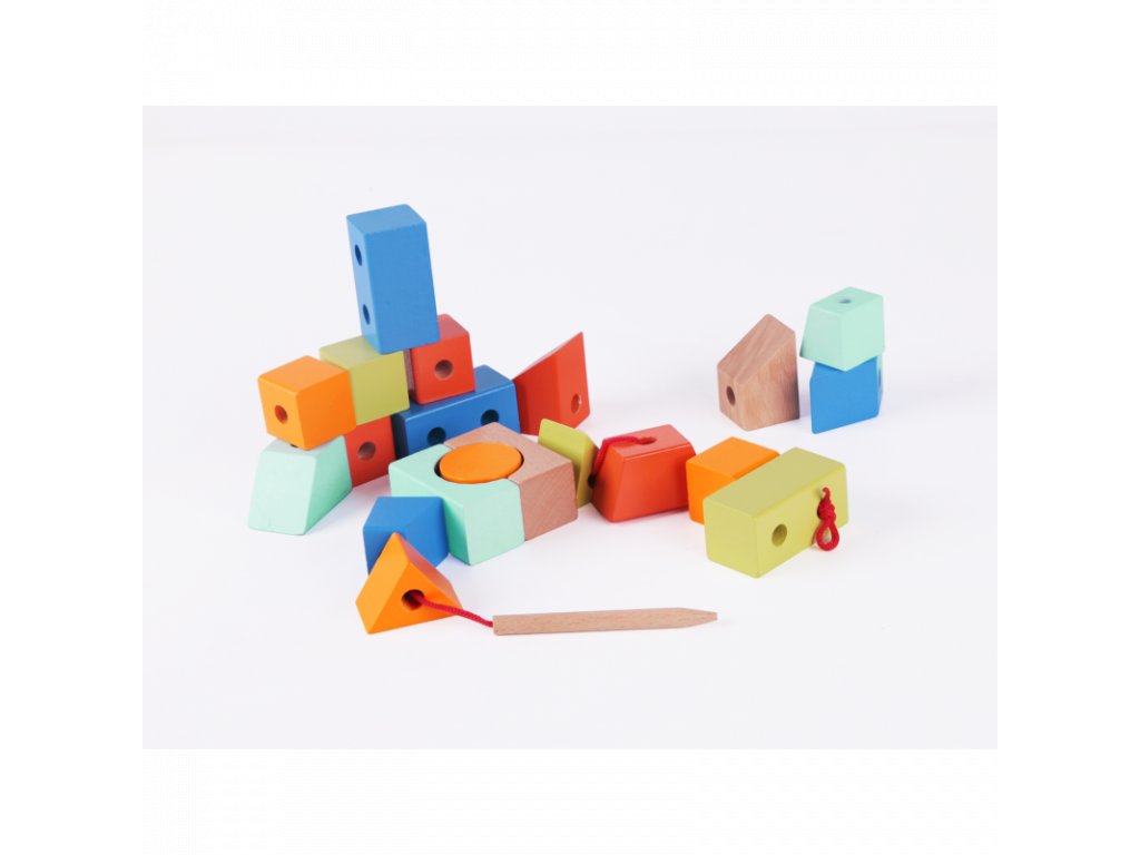 Fantastické kocky vo forme geometrických tvarov na prevliekanie. Hračka, vďaka ktorej môže dieťa rozvíjať svoje motorické schopnosti - zručnosť a presnosť pohybov. Zároveň je skvelá na sústredenie a koncentráciu, to sú vlastnosti, ktoré sa u detí rozvíjajú roky, preto sa oplatí ich stimulovať. Sada obsahuje 20 drevených kociek a 1 šnúrku na prevliekanie s dreveným hrotom. Drevený hrot umožňuje navliekanie zvládnuť aj deťom od 18 mesiacov. Kocky sú v pekných a moderných farbách. Pri navliekaní sa deti taktiež učia spoznávať geometrické tvary a farby.