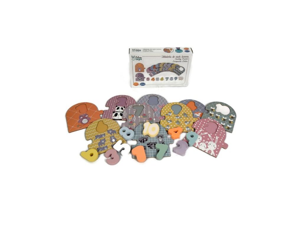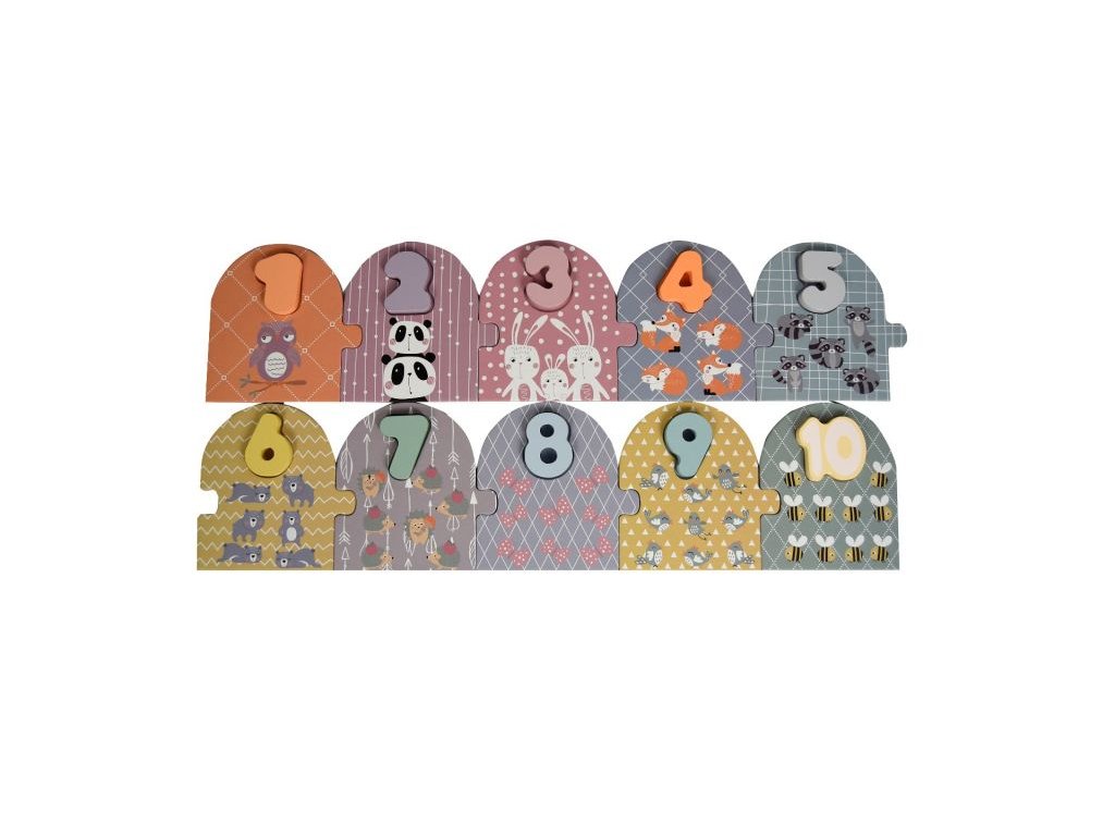 Balenie obsahuje: 10 puzzle vyrobených z vystuženej lepenky a 10 drevených číslic