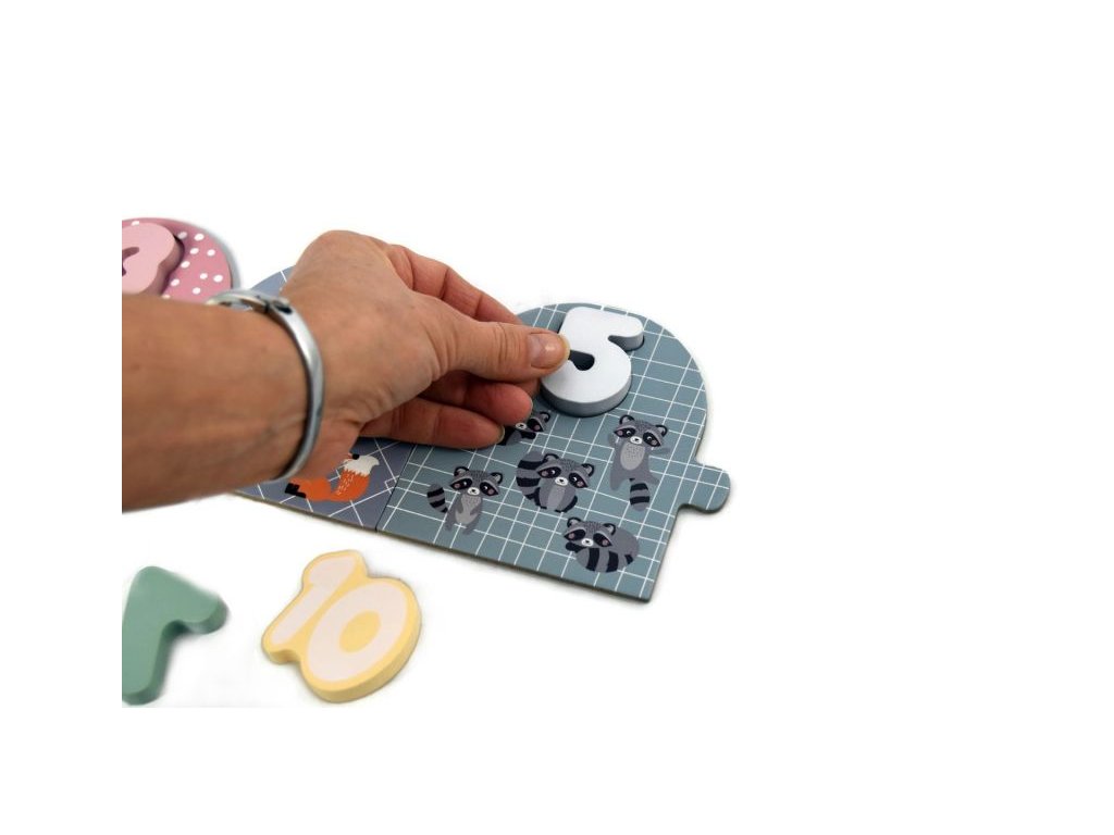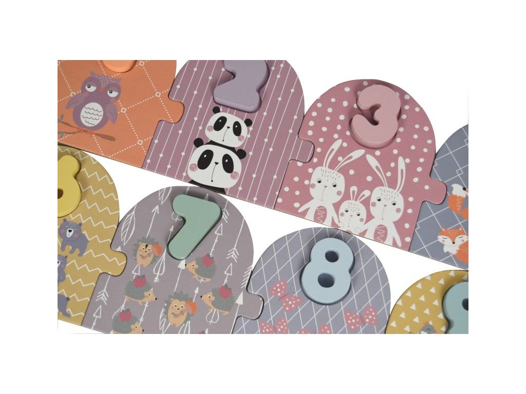 10 kartónových skladačiek sa ukladá vedľa seba, pričom sa vytvorí reťaz dlhá až 1m. Na každej kartónovej skladačke je vyrezaný otvor, do ktorého sa vkladá drevená číslica. Každé puzzle je zdobené peknými ilustráciami zvierat, počet zvierat je totožné s vkladanou číslicou. Deti sa pri hre učia počítať, trénujú jemnú motoriku a rozvíjajú koordináciu oko-ruka. Môže sa používať už od 1 roku.
