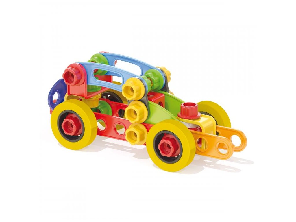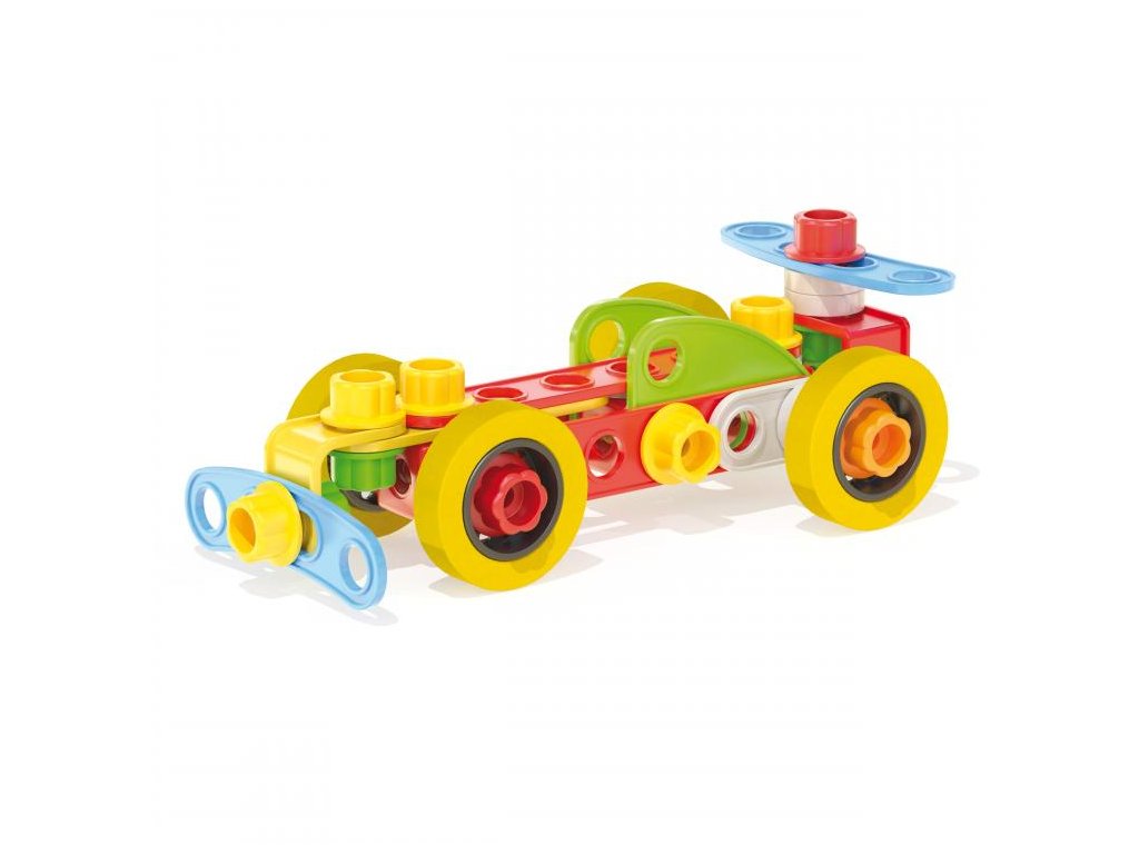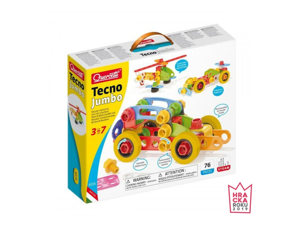 Skrutky, matice, krídlové matice, kolesá a perforované dielce z odolného, netrieštivého plastu je možné zostavovať bez použitia akéhokoľvek náradia. Deti budú potrebovať iba svoje ruky a predstavivosť. Táto sada totiž obsahuje všetko, čo je nevyhnutné na zostrojenie áut, helikoptér, žeriavov alebo ďalších strojov, ktoré im prídu na myseľ. Stavebnica Tecno Jumbo rozvíja koordináciu, logické myslenie aj tvorivosť a zábavnou formou pomáha deťom pochopiť základné princípy mechaniky. Ocenené 3. miestom v kategórii chlapčenských hračiek v súťaži HRAČKA ROKA 2019. Obsah: 24 dvojrozmerných dielcov so závitmi 8 trojrozmerných dielcov so závitmi 40 skrutiek, matíc a podložiek 4 umývateľné pneumatiky z EVA peny 1 album s 5 príkladmi modelov: SUV, formula 1, helikoptéra, žeriav, hasičské vozidloDodatočné parametre