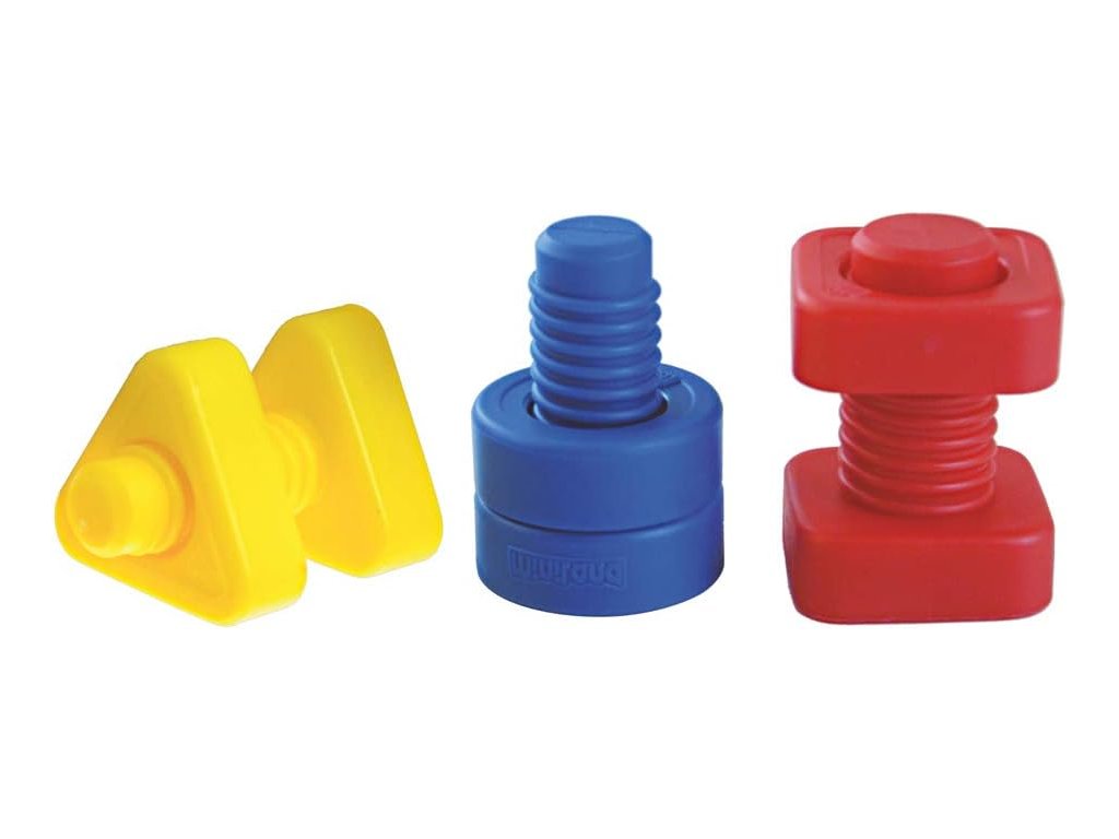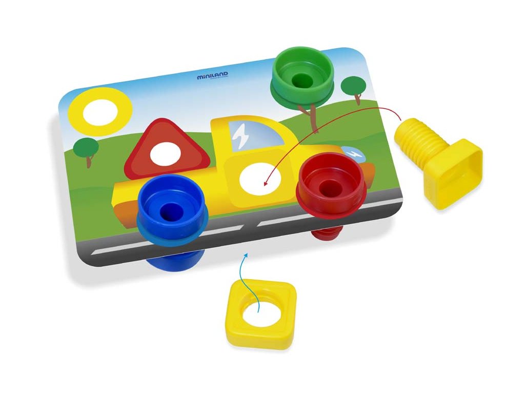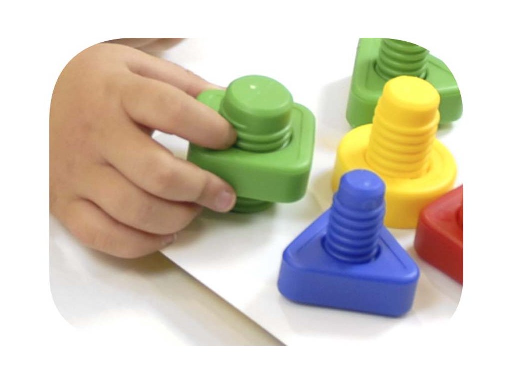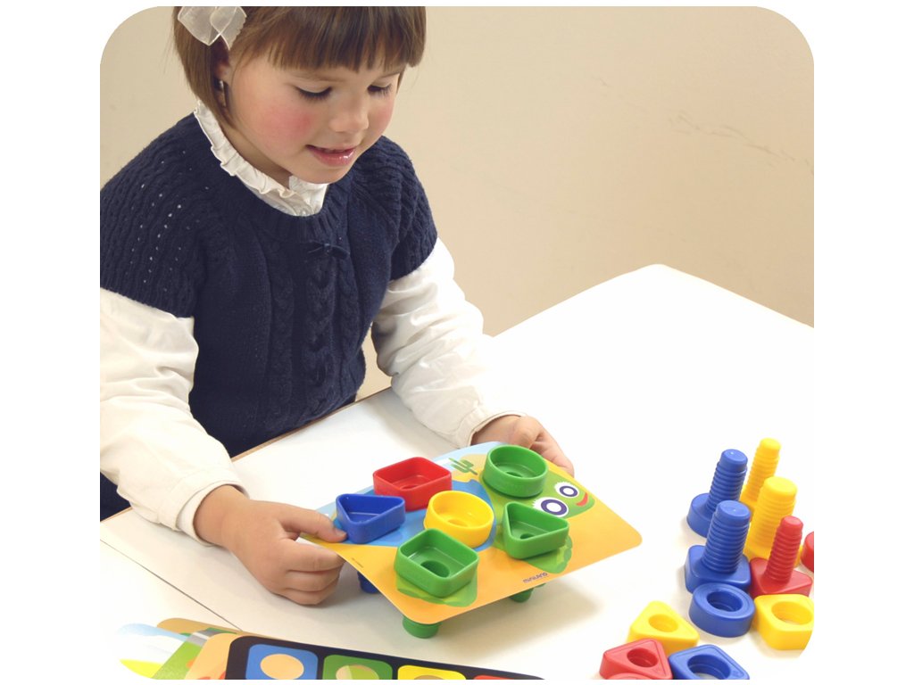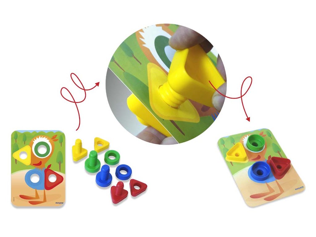 Hra so skrutkami a maticami zameraná na tréning jemnej motoriky, spoznávanie geometrických tvarov a farieb pre našich najmenších. Dieťa spája rovnaké tvary, keďže štvorcová matica pasuje iba so štvorcovou skrutkou, trojuholníková matica iba s trojuholníkovou skrutkou a kruhová iba s kruhovou skrutkou. Je to vďaka hrúbke matíc, každá matica má inú hrúbku. Dieťa spája skrutky a matice, alebo ich pripevňuje na hracie karty.