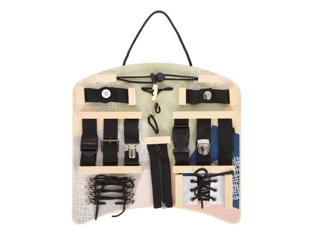 Praktická activity board z kvalitného dreva učí deti cez hru obsluhovať pracky, šnúrky či zips. Hracia doska v moderných trendových farbách predstavuje širokú škálu možných aktivít na podporu rozvoja jemnej motoriky.
