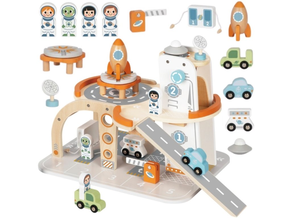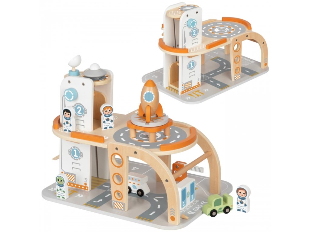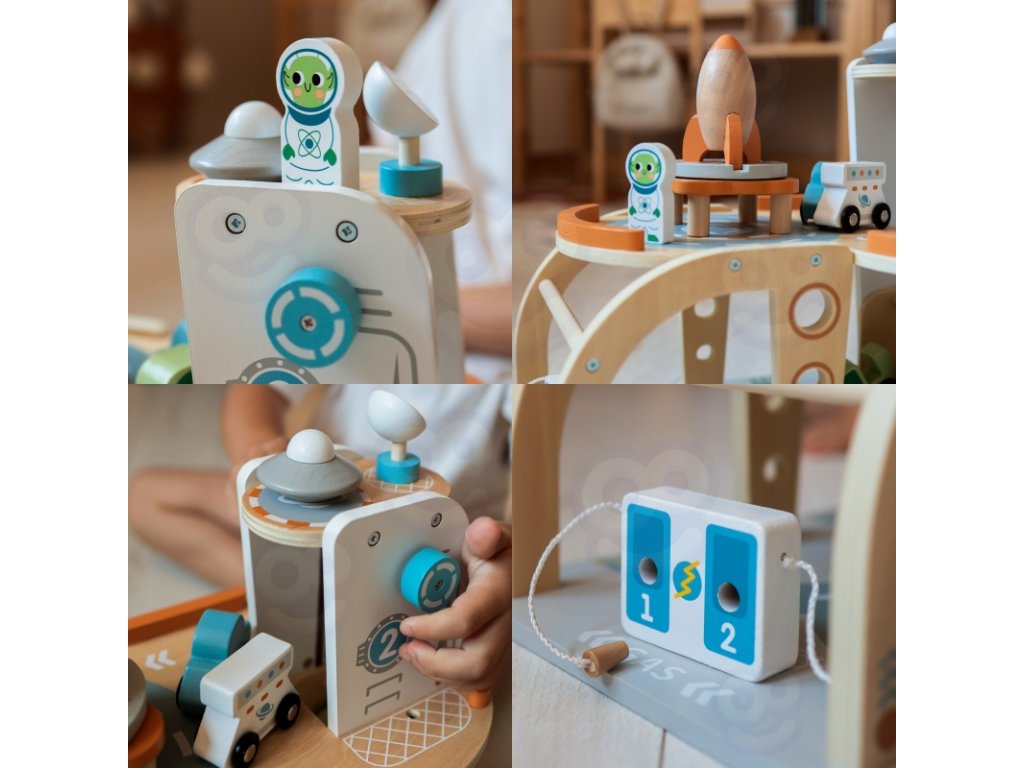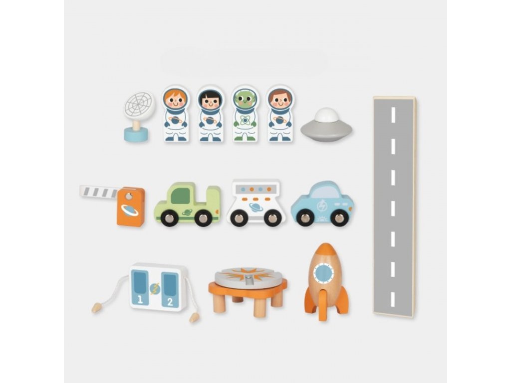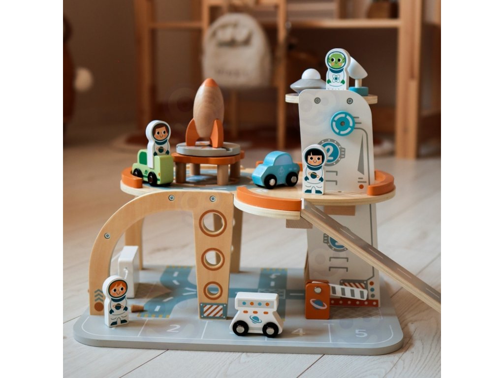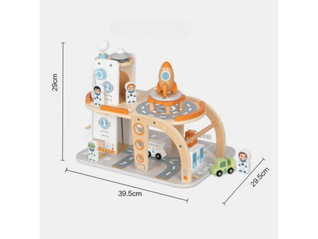Drevená sada je skutočnou lahôdkou pre malých vesmírnych prieskumníkov. Vesmírna stanica s viacerými úrovňami, rampami, pristávacou plochou pre raketu a pohyblivým výťahom sľubuje hodiny vzrušujúcej hry. Sada obsahuje nielen stanicu, ale aj vozidlá, raketu, nabíjaciu stanicu, radar, satelit.....