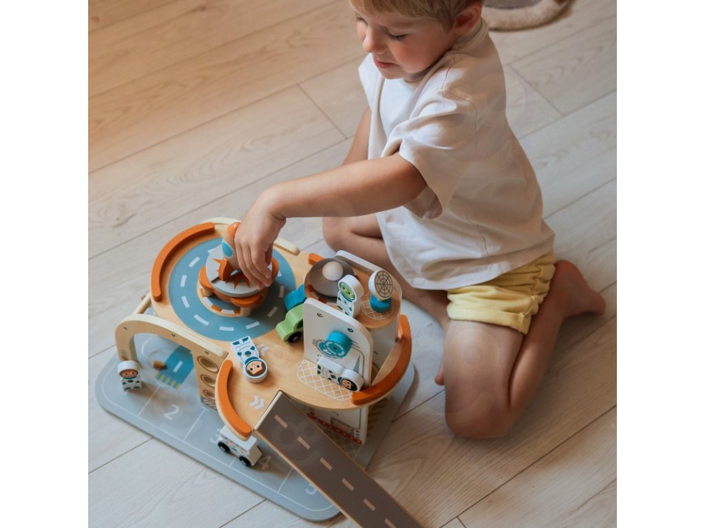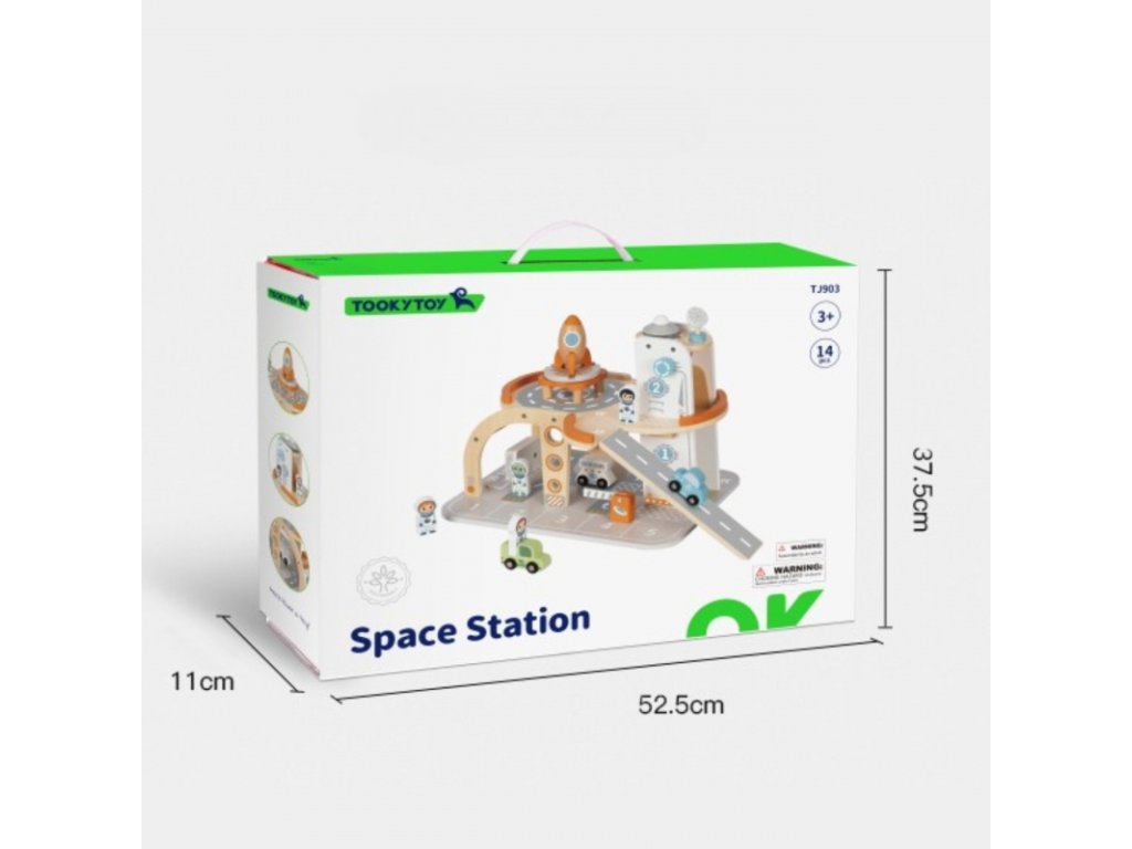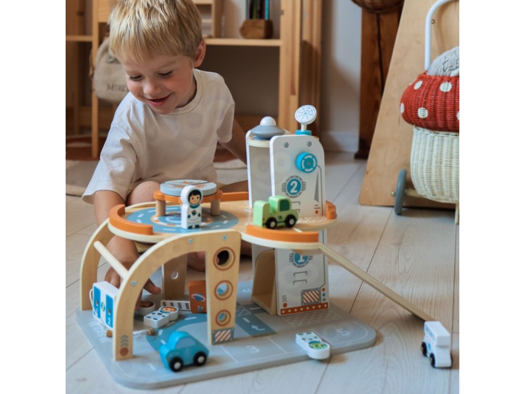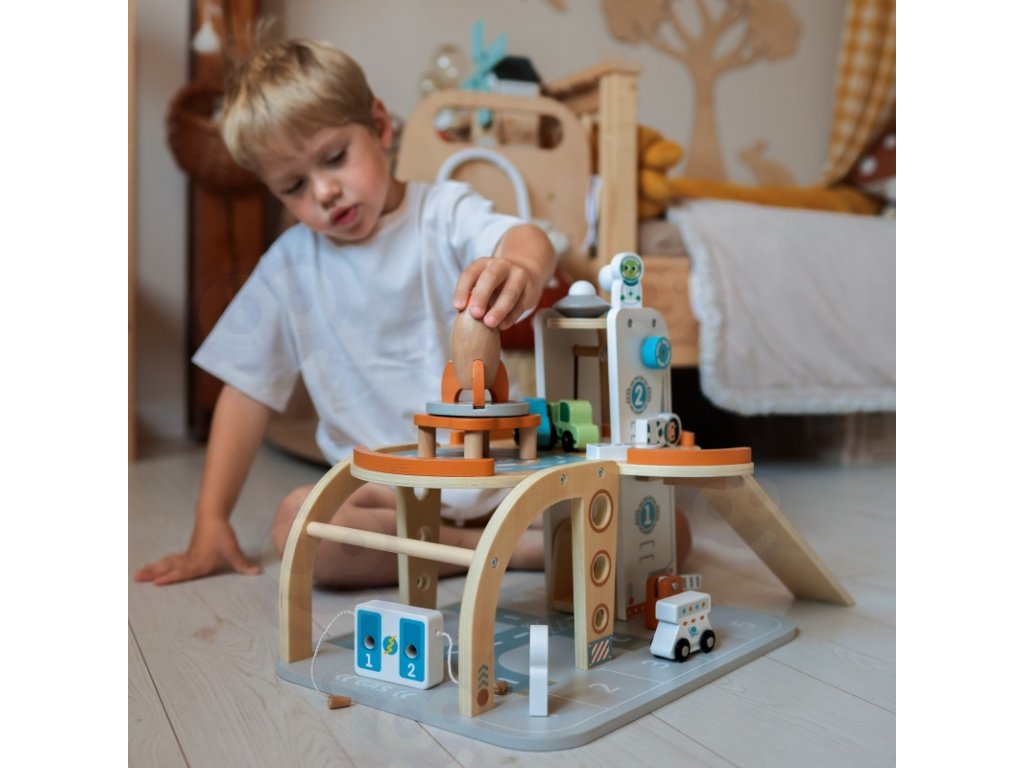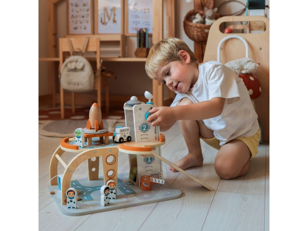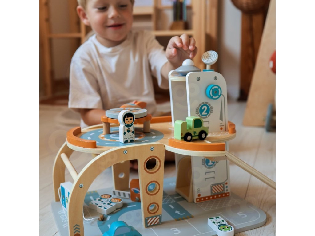 Drevená sada je skutočnou lahôdkou pre malých vesmírnych prieskumníkov. Vesmírna stanica s viacerými úrovňami, rampami, pristávacou plochou pre raketu a pohyblivým výťahom sľubuje hodiny vzrušujúcej hry. Sada obsahuje nielen stanicu, ale aj vozidlá, raketu, nabíjaciu stanicu, radar, satelit.....