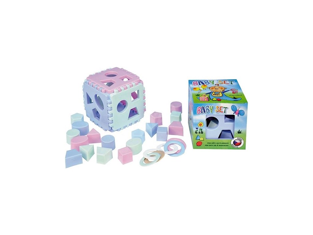 Klasika, ktorá by nemala chýbať v žiadnej detskej izbičke. Plastová kocka o veľkosti 13x13x13 cm je určená deťom od 6 mesiacov. Výrazne pomáha k rozvoju jemnej motoriky, priestorovej predstavivosti, poznávaní farieb a tvarov. V kocke je 36 dielikov v 3 pstelových farbách. Z každej farby je 6 geometrických tvarov ako sú trojuholník, lichobežník, štvorec, ovál, kruh a päťuholník. Deti okrem vkladania tvarov môžu celú kocku rozobrať a následne poskladať. Kocka je vyrobená zo zdravotne nezávadného materiálu. V sade sú pribalené aj krúžky na hryzenie.
