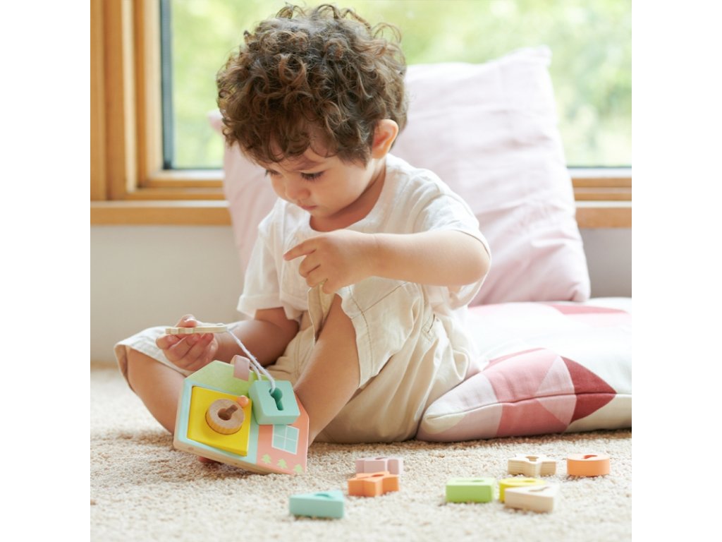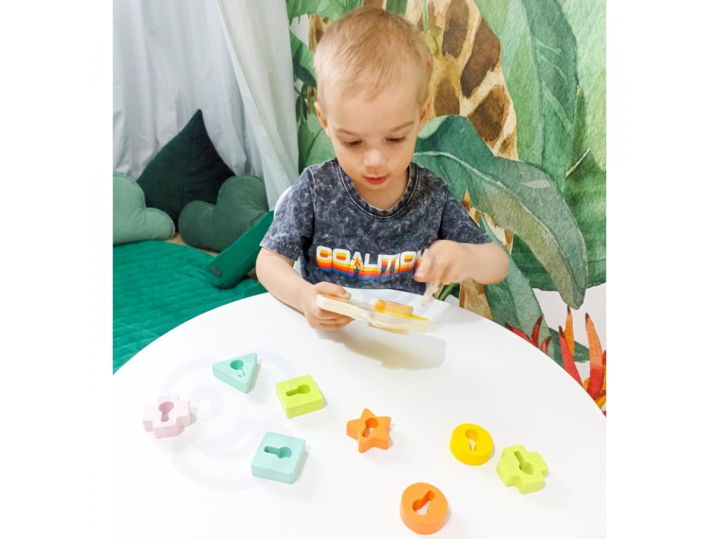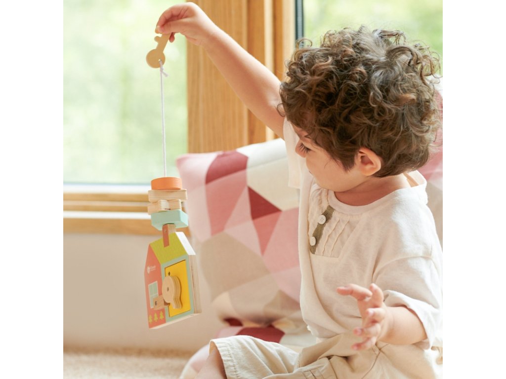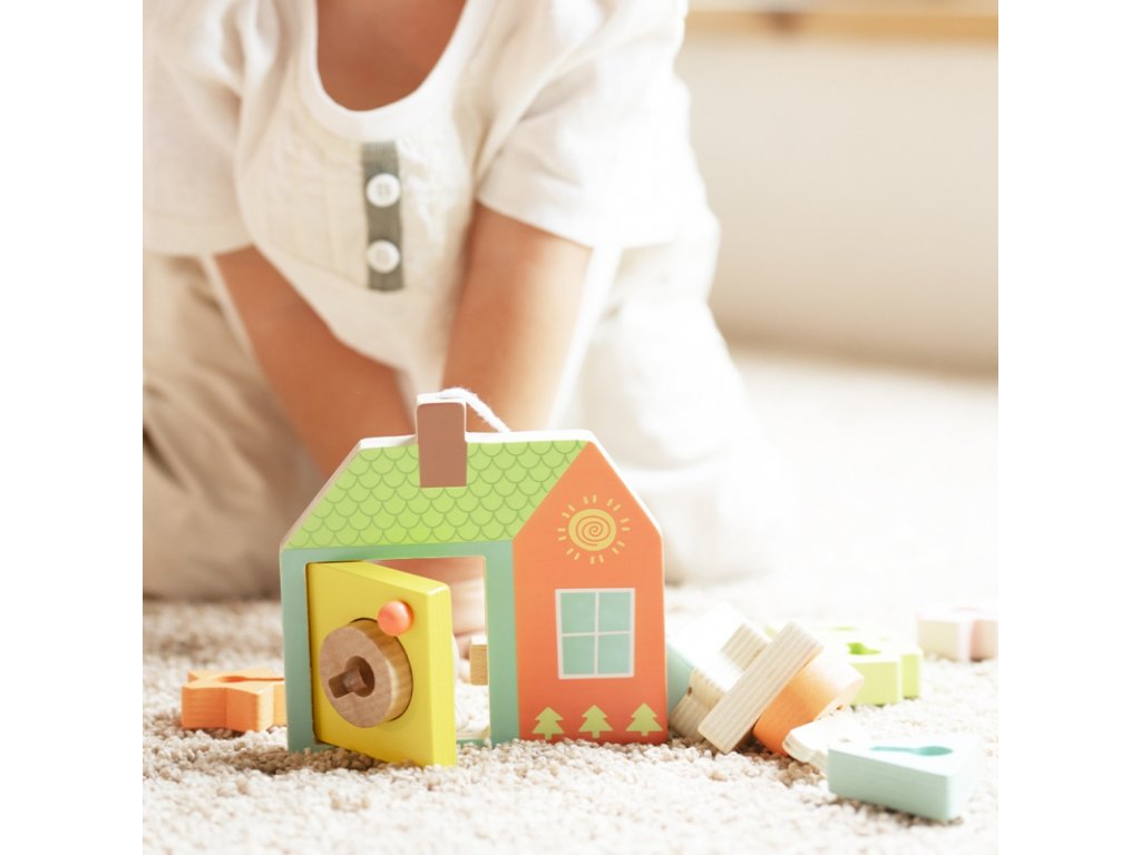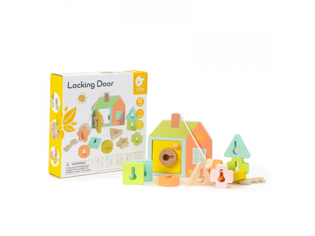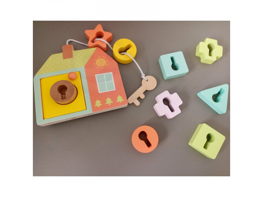 Fantastická prevliekacia hračka zameraná na najmenšie deti. Dieťa cez rôzne tvary zámkov prevlieka šnúrku v určenom poradí podľa zadania. Stretáva sa pritom s piatimi rôznymi tvarmi a šiestimi rôznymi farbami. Prievliekanie šnúrky cez dierku si vyžaduje presnosť pohybov a sústredenie, vďaka čomu si deti stimulujú schopnosť sústrediť sa. Dvere majú západku, dajú sa otvoriť kľúčom.